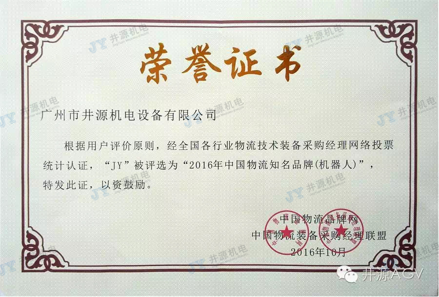 在2015年度,井源機(jī)電也被評(píng)為“中國(guó)物流知名品牌(機(jī)器人)”,連續(xù)兩年獲此榮譽(yù),說(shuō)明用戶(hù)對(duì)我公司工業(yè)移動(dòng)機(jī)器人產(chǎn)品的肯定,同時(shí)也是對(duì)我們最好的激勵(lì)。